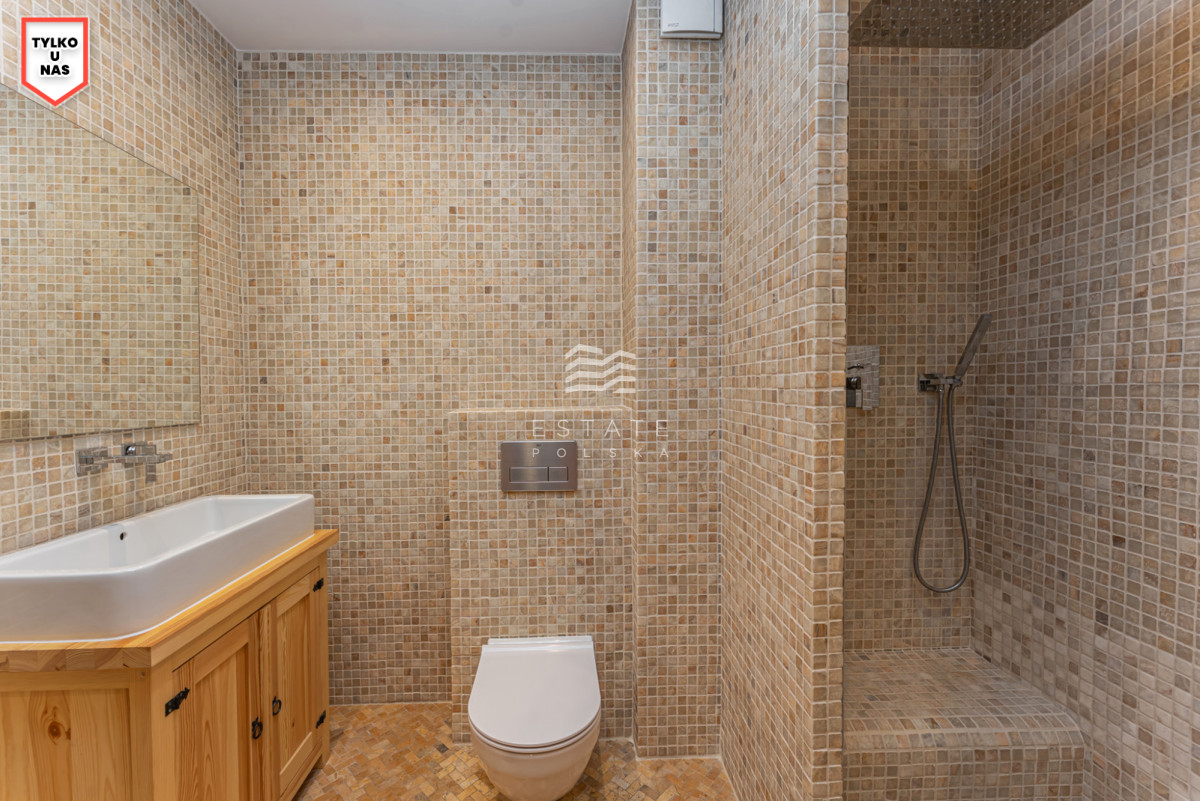 - Wysokiej jakości materiały – na podłodze marmur i lita deska dębowa, w łazience naturalny onyks, drzwi drewniane marki PORTA,
